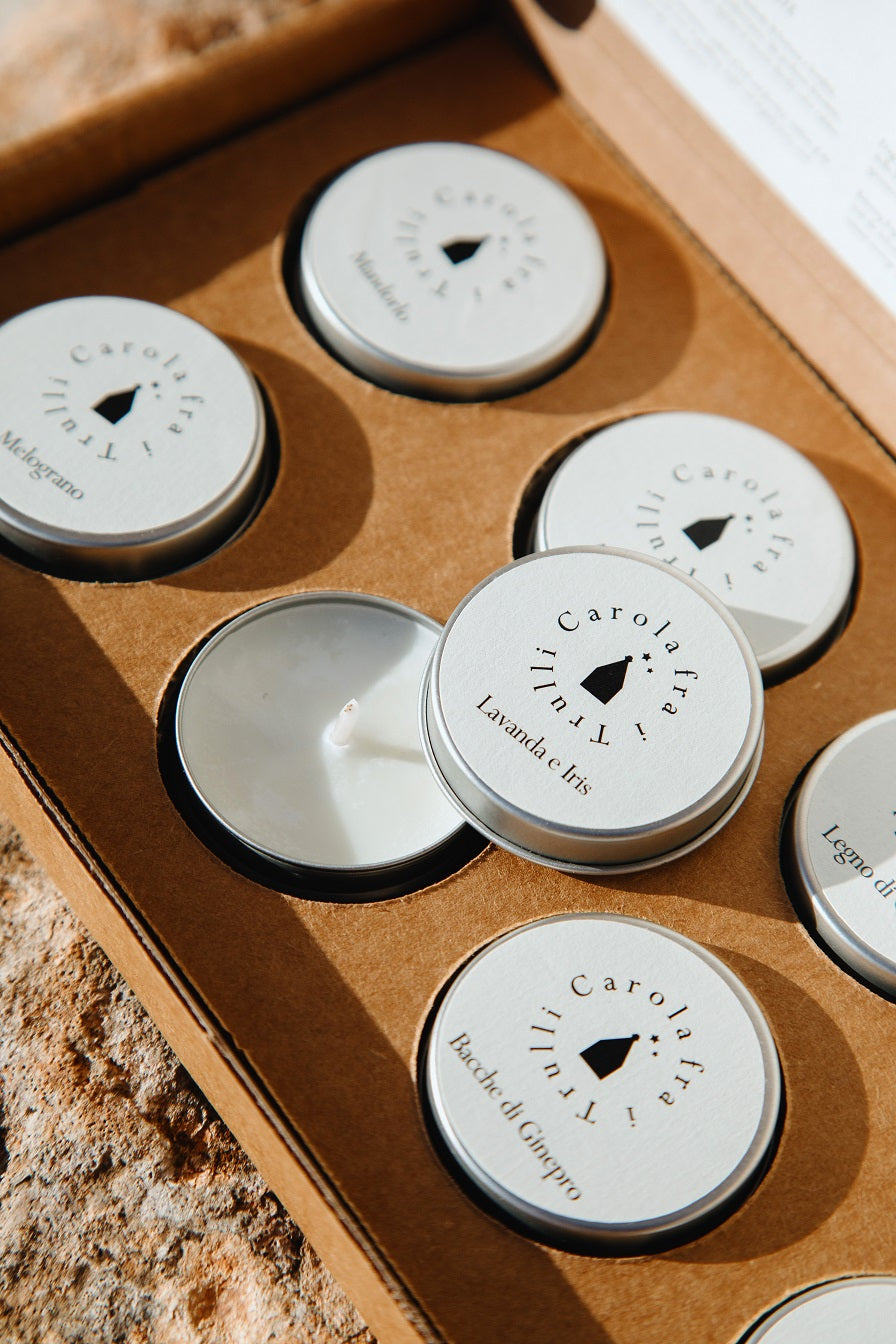 Perfect as placeholders for a romantic table or to create a relaxing atmosphere and connect with oneself, the scented tealights of Carola fra i Trulli are an invitation to immerse oneself in the smells of Nature following the rhythm of the seasons, letting oneself be enveloped by the functional well-being given by the essential oils of the fragrances and the small light of the flame.